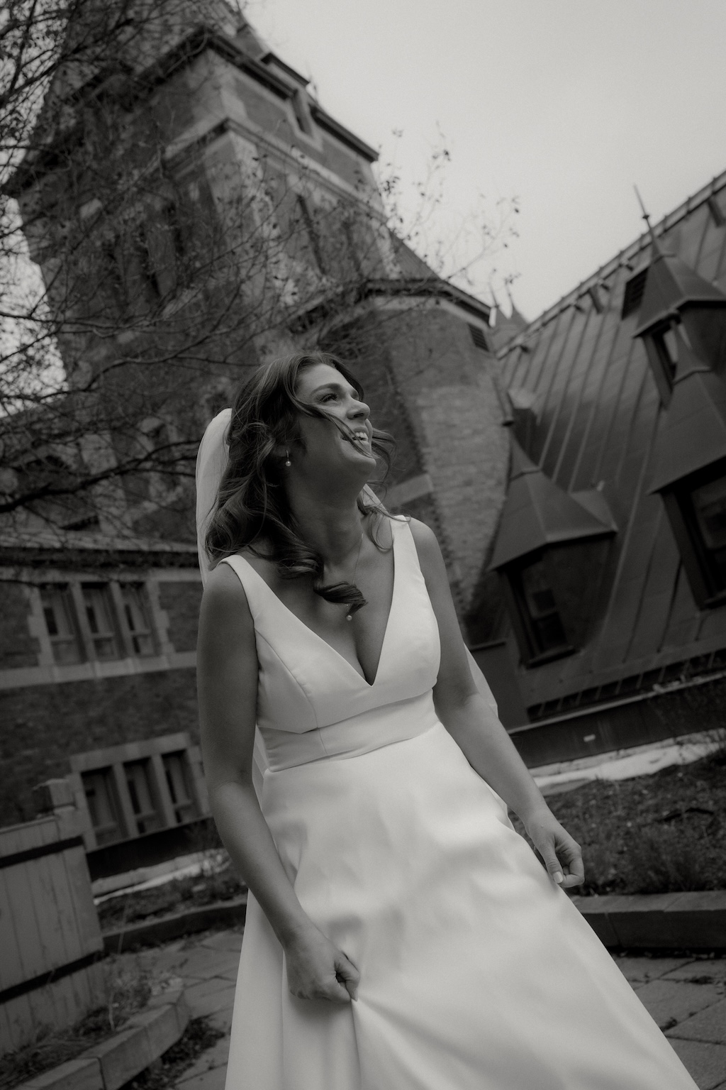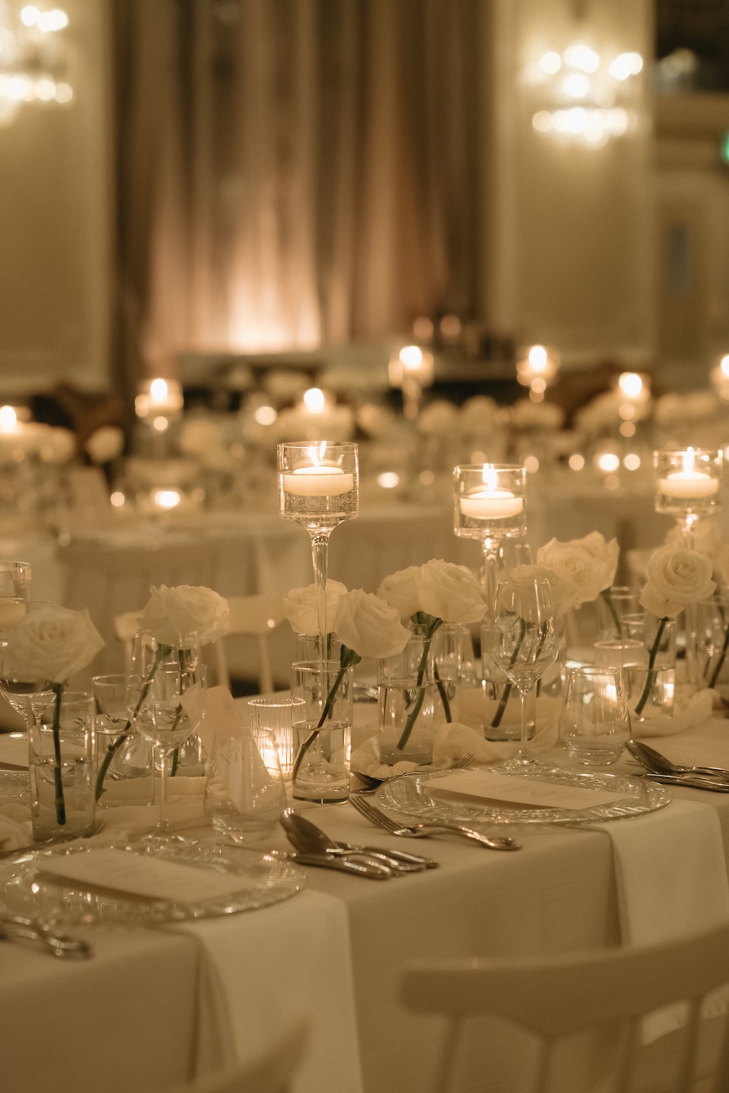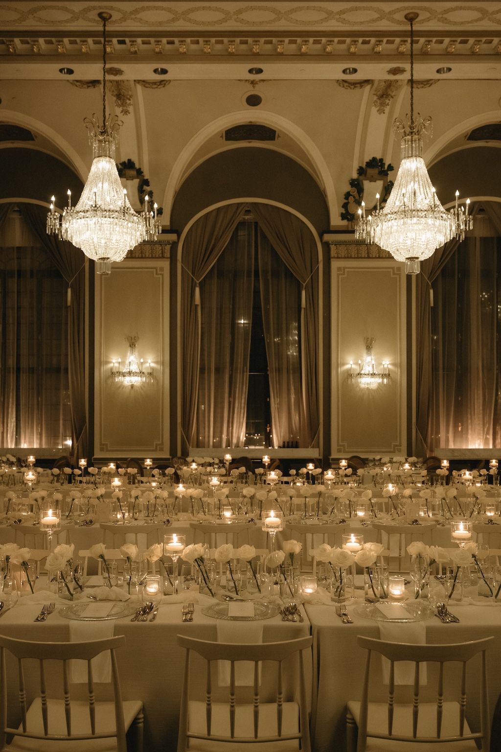 Despite a cold, grey Fall wedding day in November, the atmosphere inside was transformed into an ethereal, out-of-time experience through a refined all-white wedding concept. Hundreds of white roses were curated into a white wedding decor aesthetic that felt both modern and minimalist, blending purity, softness, and architectural elegance. The result was a luminous, contemporary design that elevated the historic grandeur of the venue while creating a serene, romantic, and unforgettable ambiance. An exquisite expression of love, legacy, and timeless beauty in the heart of Quebec City.